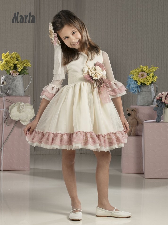 Modelo M015: Éste diseño aúna elegancia y sofisticación en todos sus detalles. La manga estilo francesa con transparencia y fundida al final dota de gran elegancia al vestido y, además la niña podrá tener los brazos cubiertos, siendo más cálido que cualquier vestido de manga corta o tirantes. Por otro lado, el color rosa empolvado dota de feminidad y dulzura al look.
