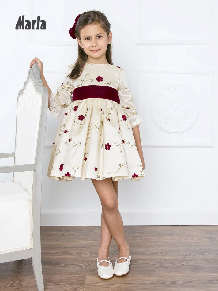 Modelo 021: Si lo que prefieres es un look más clásico entonces este diseño es el tuyo. En tejido brillante en tonos marfil con bordados y fajín en granate tu pequeña será la más elegante de la celebración. Además las pequeñas tablas que forman la falda resta seriedad al look y las mangas más largas de lo habitual serán perfectas para un día frío. El toque final perfecto será un lazo granate en su peinado.